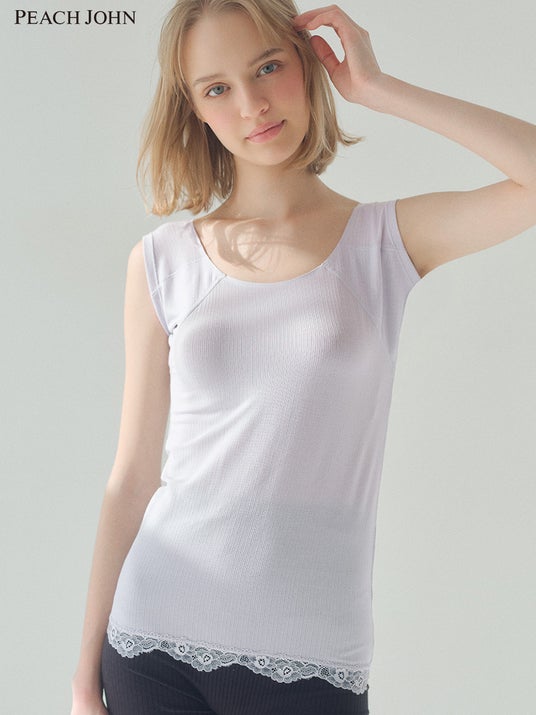 袖下を長く伸ばしてワキを広範囲にカバーし、ぴったりフィットする形のタンクトップ。ネックラインはトップスからチラ見えしにくい広めのラウンドカットになっています。