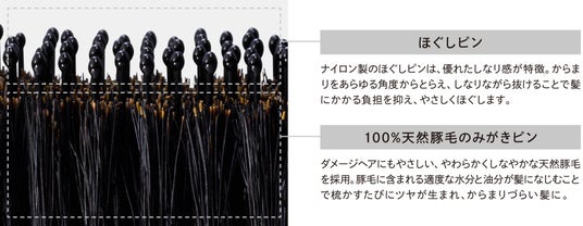 ほぐしピンがからまりをほぐし、天然豚毛のみがきピンがやさしくみがく。