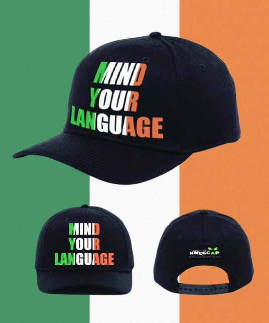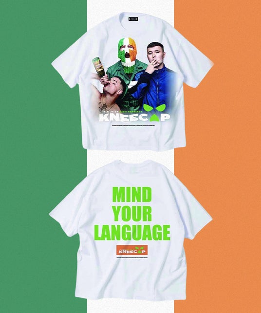 フロントに「MIND YOUR LANGUAGE」の文字をアイルランド国旗のカラーで、バックにKNEECAPのロゴをデザインしました。