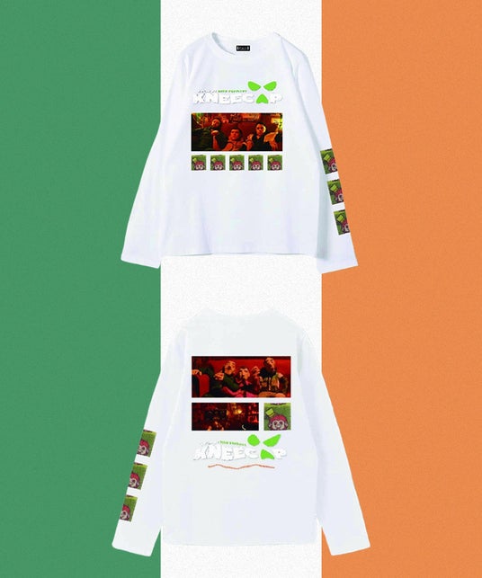 ロングスリーブは映画のワンシーンから着想を得てデザイン。フロントはKNEECAPのメンバー、バックは同じシーンのメンバー3人が粘土の人形になったシーンをデザイン。そのまわりに配された“猿のイラスト”にも映画を見た人にはわかる絶妙な意味合いが。