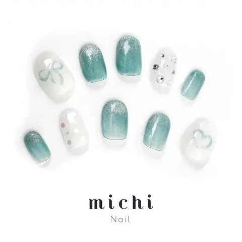 爽やかなミントグリーンのマグネットジェルグラデーションにぷくっとした立体のリボンとハートでキュートさも!
