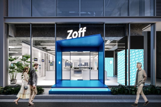また、店内のPOPにはデジタルサイネージを積極的に活用し、分かりやすい案内表示を実現。店舗には奥行きがあり、正面入り口にはZoffのブランドカラーであるブルーを採用することで、まるでラボラトリーへと足を踏み入れるかのような体験を提供します。