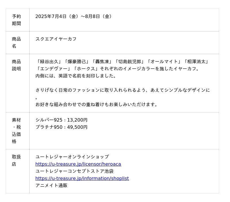 株式会社ユートレジャー(本社:東京都新宿区、代表取締役:青木 興一、株式会社ケイ・ウノの連結子会社)は、TVアニメ『僕のヒーローアカデミア』(原作:堀越耕平(集英社 ジャンプコミックス刊))とのコラボレーションアイテム「スクエアイヤーカフ」8種類の予約受付を2025年7月4日(金)~8月8日(金)の期間、ユートレジャーオンラインショップ、ユートレジャーコンセプトストア池袋にて行います。