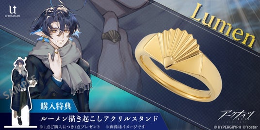 このたびの新作はルーメンが常に右手の人差し指に着けているリング(指輪)を細部にまでこだわり再現しました。ご購入特典として、描き起こしアートを使用したアクリルスタンドを商品1点につき1つプレゼントします。