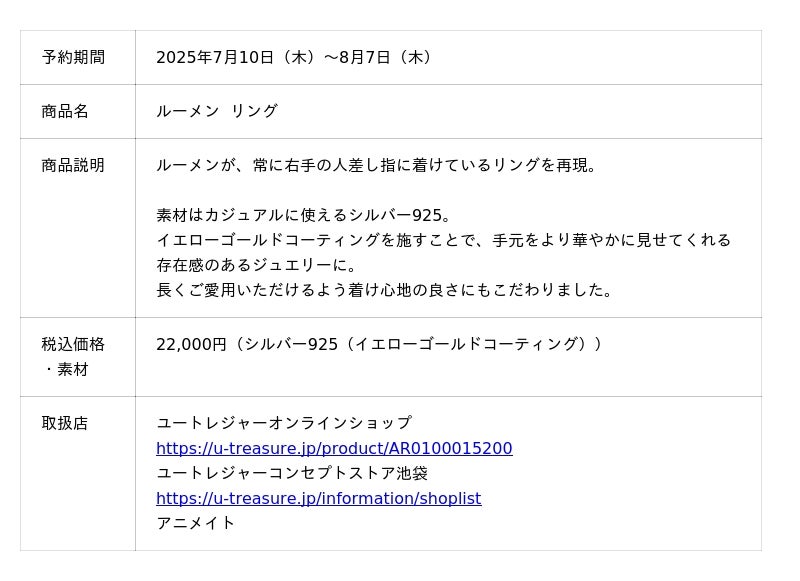 株式会社ユートレジャー(本社:東京都新宿区、代表取締役社長:青木 興一、株式会社ケイ・ウノの連結子会社)は、スマートフォン向けゲームアプリ「アークナイツ」とコラボレーションした「ルーメン リング」の予約受付を2025年7月10日(木)~8月7日(木)の期間、ユートレジャーオンラインショップ、ユートレジャーコンセプトストア池袋にて行います。