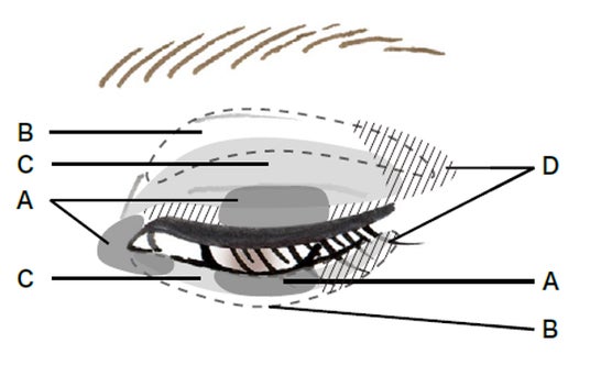 2:Bを上まぶたのCと肌との境目をぼかすようにブラシで入れ、下まぶたにも入れます。