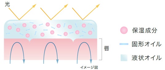 粘度の高い液状オイルに固形オイルを溶かし込みオイル膜をキープするモイストキープ処方により、水分蒸散を防ぎ、乾燥しがちな唇のキメや凹凸にもとろりと入り込みながら、塗膜の表面がフラットになることで、光を反射しやすく鏡面的な美しいツヤを演出します。