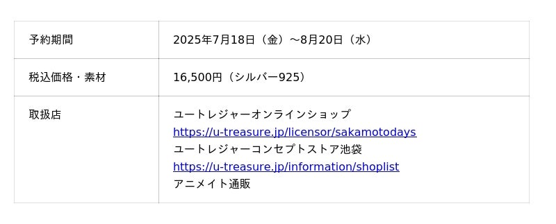株式会社ユートレジャー(本社:東京都新宿区、代表取締役社長:青木 興一、株式会社ケイ・ウノの連結子会社)は、TVアニメ『SAKAMOTO DAYS』とのコラボレーションアイテム「プレートネックレス」を発売します。2025年7月18日(金)~8月20日(水)の期間、ユートレジャーオンラインショップ、ユートレジャーコンセプトストア池袋にて予約受付を行います。