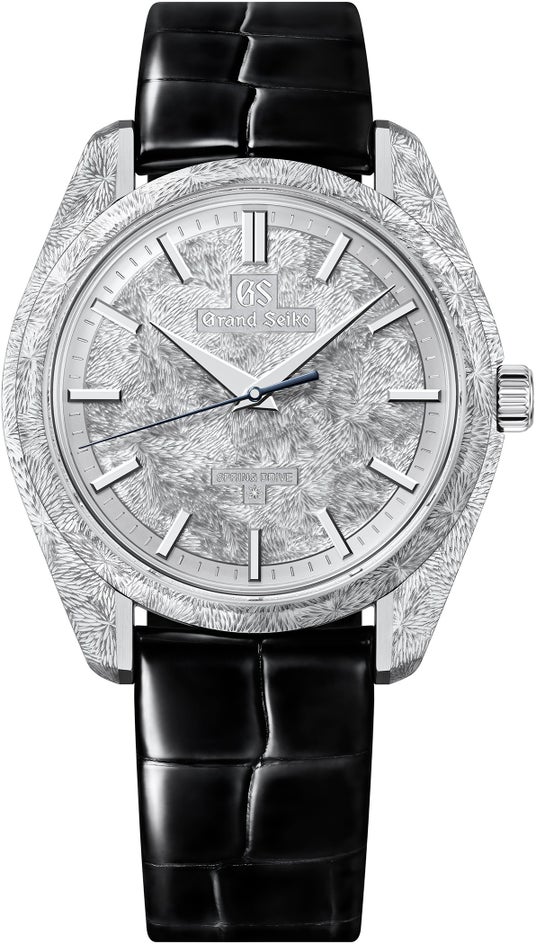 グランドセイコーのスプリングドライブモデルの製造地である信州。その蓼科高原には、美しい原生林が広がっており、木々の間を蓼科大滝が流れています。滝は、その水の勢いの強さから飛泉とも呼ばれますが、本作は、その飛泉が生み出す幻想的な情景を、匠がハンド エングレービングで写し取りました。ケースとダイヤルに施された、繊細かつダイナミックな模様が、日本独自の美意識から生まれた光と陰の多様な表情を生み出します。