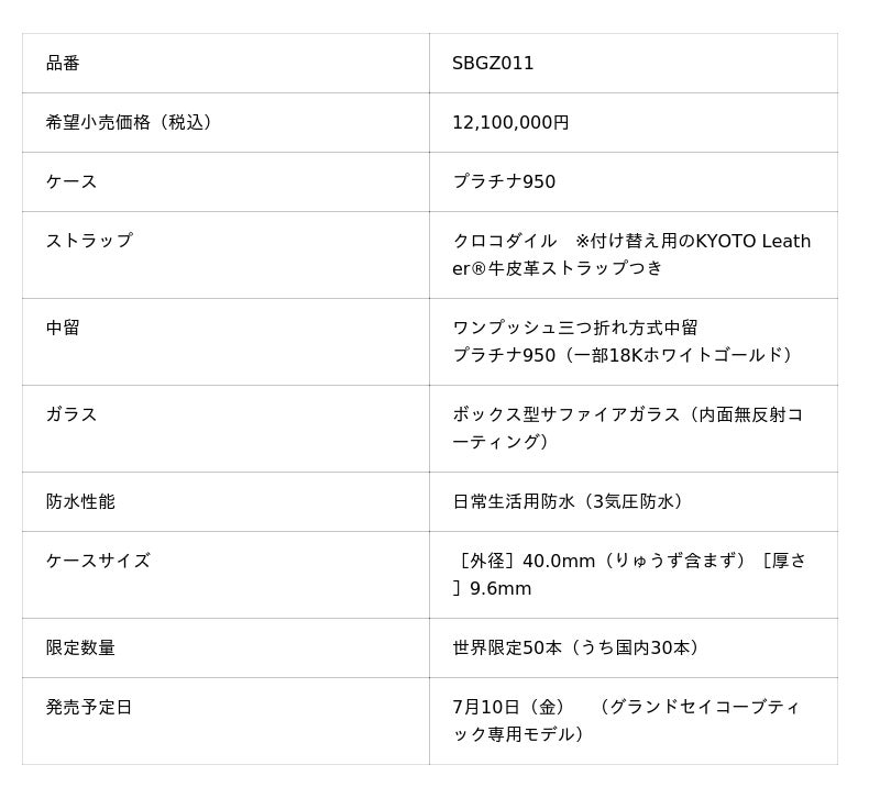 セイコーウオッチ株式会社(代表取締役会長 兼 CEO 兼 CCO:服部 真二、本社:東京都中央区)は、<グランドセイコー>マスターピースコレクションより、神秘的な原生林に流れる飛泉の美しさを写し取った限定モデルを発売いたします。7月10日(金)発売予定で、希望小売価格は12,100,000円(税込)、全世界50本限定です。