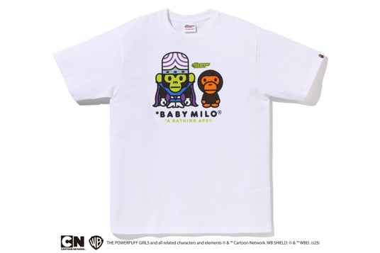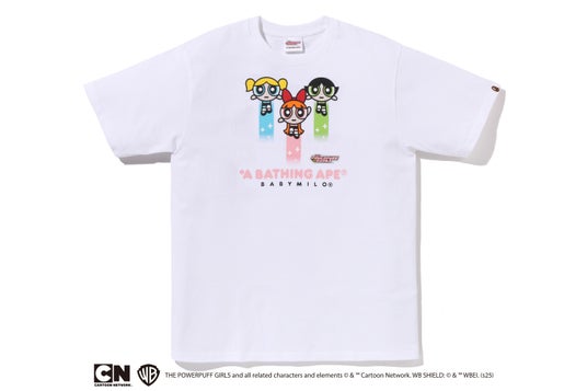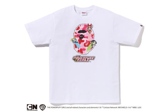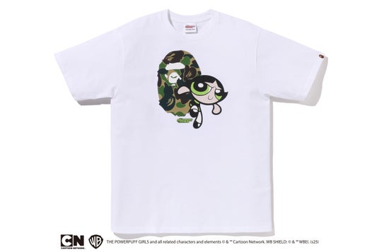 また、ブロッサム、バブルス、バターカップのキャラクターカラーに合わせて、ピンク、ブルー、グリーンのABC CAMOをそれぞれAPE HEADと組み合わせたグラフィックTシャツも登場します。こちらはホワイトのみの展開で、3人の個性を際立たせる1枚に仕上げています。