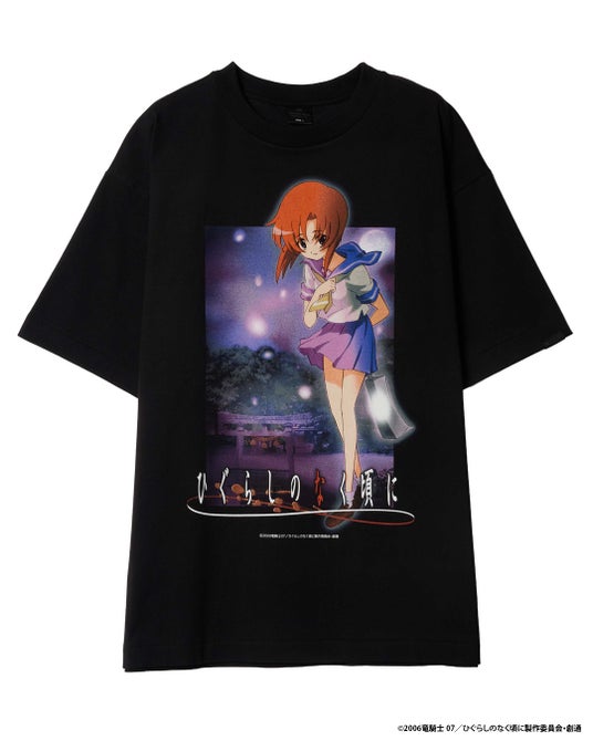 2006年に放送されたアニメ『ひぐらしのなく頃に』より、印象的なキービジュアルを大胆にプリントしたTシャツです。ヒロイン・竜宮レナが後ろ手に鉈を持ちながら微笑む、可愛らしさと狂気が入り交じる本作を象徴するキービジュアルを採用しました。