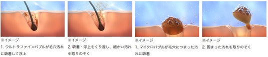ウルトラファインバブルが毛穴の奥まで入り込んで汚れを取りのぞき、マイクロバブルが毛穴につまった大きな汚れを浮かせて取りのぞきます。