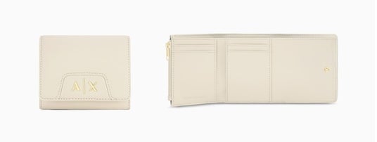ウィメンズからは、フロントに配したAXロゴがアクセントになった、ミニマルでモダンな三つ折りミニウォレット。コンパクトなサイズながら、幅広の紙幣コンパートメント、4つのカードスロット、コインパースを備えた実用的なデザインです。