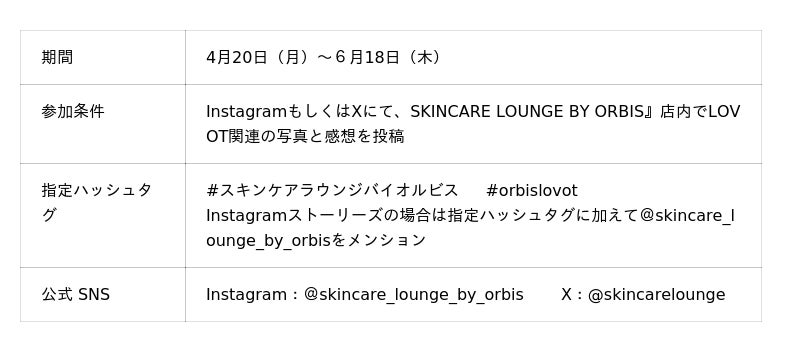 オルビスは、創業以来「肌が本来もつ力を信じて、引き出すこと」を信念とし、「ここちを美しく。」をブランドメッセージに掲げるビューティーブランドです。オルビス初の体験特化型施設『SKINCARE LOUNGE BY ORBIS』では、自身の肌状態を理解し、美しさを引き出す正しいスキンケア方法を学びながら、気軽に商品をお試しいただけるようなコンテンツや、「ORBISアプリ」会員様限定で体験いただける完全予約制のスキンケアトリートメント・ワークショップの提供など、さまざまなコンテンツをご用意しています。
