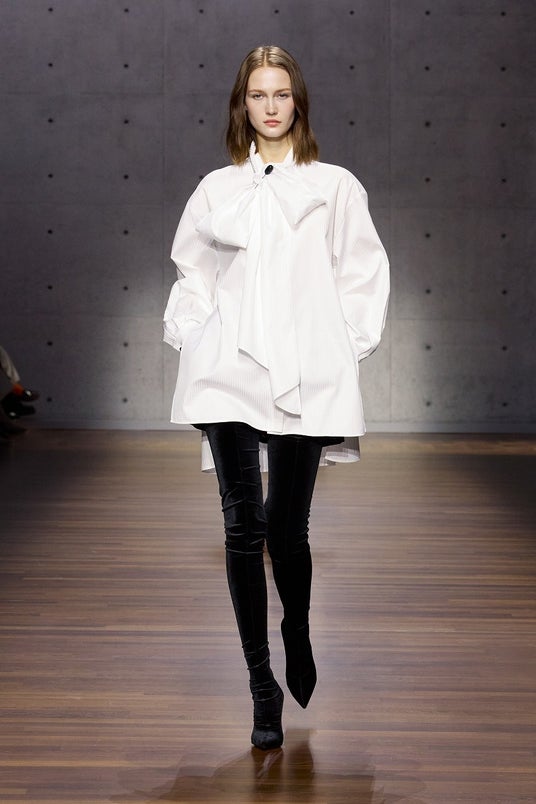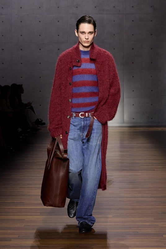縦のラインを意識しながらも柔らかく、端正なショルダーと動きのあるシルエットが印象的。トレンチコートや身体を包み込むようなオーバーコート、ジャケット、スーツ、ロングカーディガン、ソフトなニット、クロップドパンツに合わせたシャツなど、エンポリオのアイコニックなフォルムが新たな解釈で再構築されました。深いプリーツを施したバミューダショーツや、デイリーカジュアルとラグジュアリーな要素を併せ持つデニムも登場します。