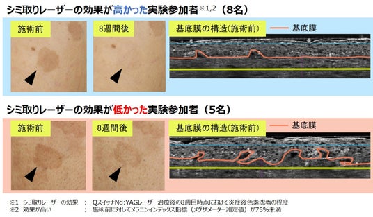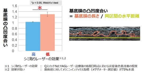 肌を傷つけることなく肌内部の構造を可視化できる手法として、ラインフィールド共焦点光干渉断層撮影(LC-OCT)を用いて、13名の実験参加者に対してシミ取りレーザー治療(QスイッチNd:YAGレーザー)の前後で基底膜の構造に関する解析を行いました。その結果、施術2ヶ月後のシミの治療効果(※1)が低い群は、シミ部位の基底膜の凸凹度合い(起伏)が大きいことを発見しました(図1)。基底膜の凸凹度合いは観察された基底膜の長さを同じ区間の水平距離で割ることで算出したものであり、シミ取りレーザーの効果が高い群と低い群では優位な差が確認できました(図2)。