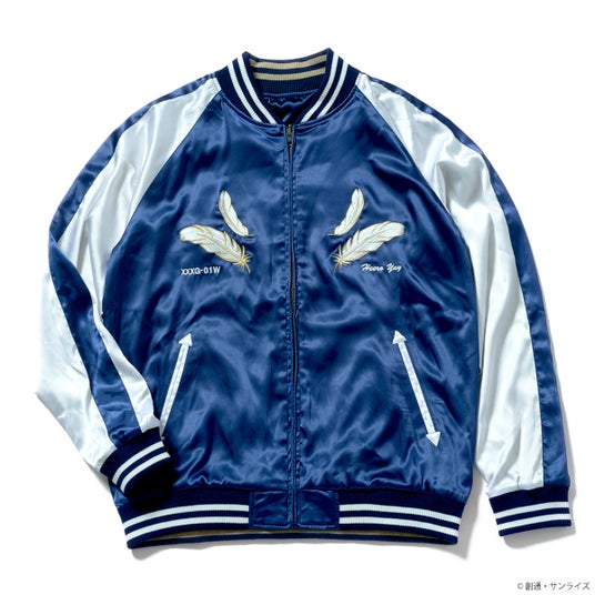 『新機動戦記ガンダムW』30周年を記念し、『新機動戦記ガンダムW Endless Waltz』より、ウイングガンダムゼロ(EW)柄のスカジャンが登場!本商品は、光沢がありさらっとしたサテン地に、ダイナミックなイラストを繊細な刺繍で表現したリバーシブル仕様のスカジャンです。サテン調の光沢生地を用いたスカジャンの表面はブルー×ホワイトの配色で、フロント左右に羽根、背中にツインバスターライフルを構えたウイングガンダムゼロ(EW)を組み合わせたデザイン、又、リバーシブルになる裏面はブルー×シャンパンゴールドの配色で、フロントにプリベンターのマーク、背中にPreventer A.C.19のロゴ刺繍にて、存在感を放つアイテムです。身頃には両面仕様のダブルジップを使用しており、どちらの面でもスタイリングをお楽しみいただけます。