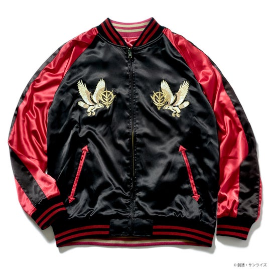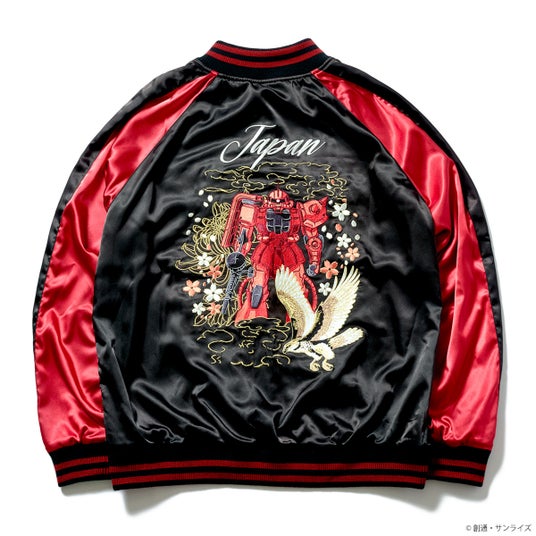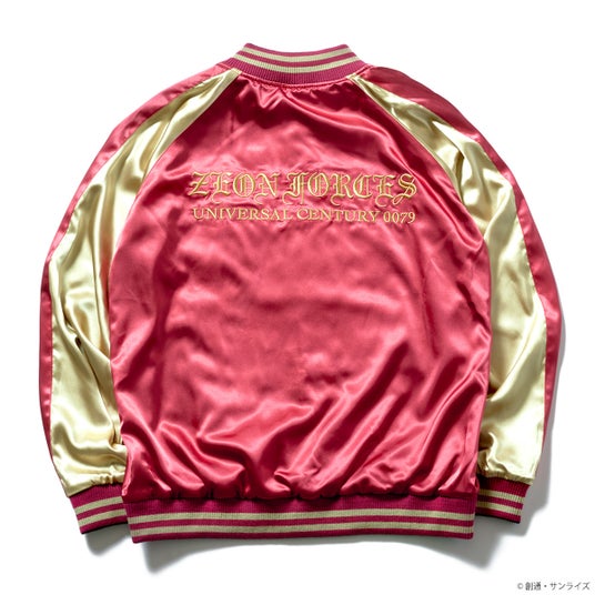 シャア専用ザクIIモデルは、表面ブラック×レッドの配色で、フロント左右に鷹とジオン公国軍のマークを刺繍、背中に鷹と桜、シャア専用ザクIIを組み合わせた和柄テイストのデザイン、リバーシブルになる裏面はピンクレッド×ゴールドの配色で、背中にロッカーテイストのZEON FORCEロゴを刺繍、存在感を放つアイテムです。