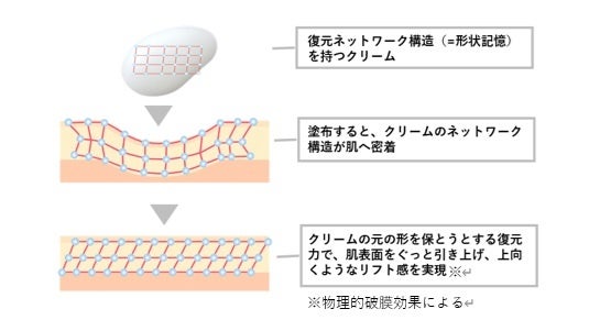 独自のネットワーク構造をもつ、もちっと弾力のあるクリームが、塗布した瞬間に上向きの形を記憶。肌を引き上げるように密着し、リフト感のあるハリ肌を長時間キープします。
