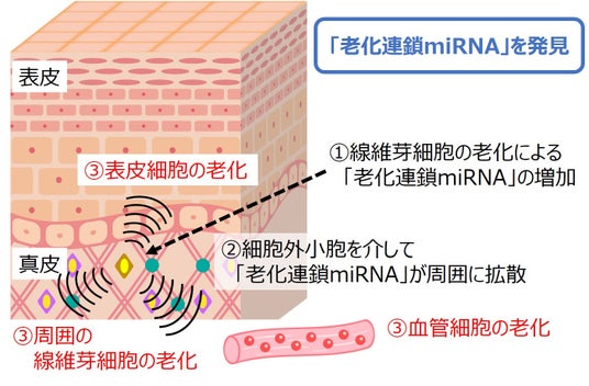 次に、この特定のmiRNAが肌をつくる主だった細胞の老化に影響を与えているかを検証しました。このmiRNAと同じ配列をもつ模倣物質を表皮細胞、線維芽細胞、血管内皮細胞に添加したところ、細胞増殖能の低下や細胞老化を示すタンパク質の増加が確認されました。すなわち、この特定のmiRNAは老化した線維芽細胞から細胞外小胞を介して、周囲の他の線維芽細胞や表皮細胞、血管細胞の老化を引き起こす「老化連鎖miRNA」であることが明らかになりました(図1)。