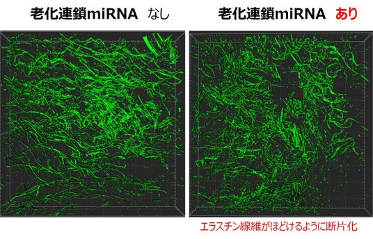 また、ヒトの皮膚組織に「老化連鎖miRNA」の模倣物質を添加したところ、皮膚の弾力性を保つエラスチン線維が細かく分断されていることが観察されました(図3)。これは、これまでに知られている加齢による皮膚組織の変化と非常に類似しており、「老化連鎖miRNA」が組織レベルでも老化を誘発する可能性を示しています。
