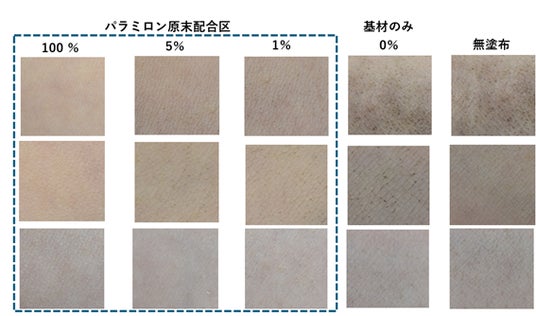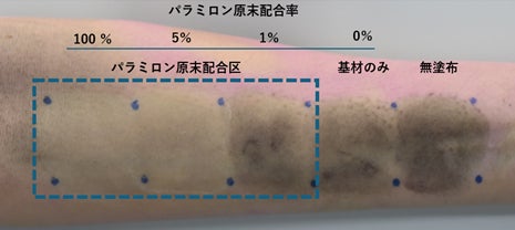 図3:パラミロン原末およびパラミロン原末を配合したゲルを前腕内側部に塗布し、微粒子モデルをすりこんだ様子