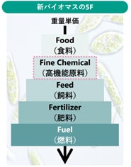 当社はユーグレナなどの微細藻類の活用において、重量単価が高い順にFood(食品)、Fine Chemical(ファインケミカル/高機能原料)、Feed(飼料)、Fertilizer(肥料)、Fuel(燃料)の順で展開する「新バイオマスの5F」の考えに基づいて事業を推進しています。