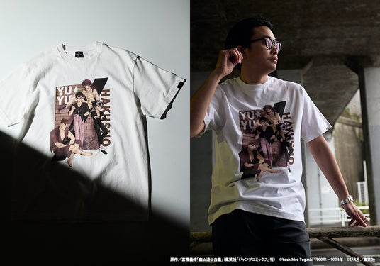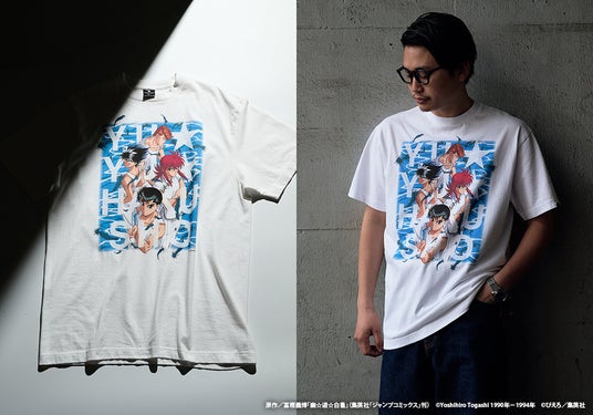 冨樫義博による漫画を原作とした90年代を代表するTVアニメ『幽☆遊☆白書』より、各種ビジュアルを使用したアイテムを多数ラインナップ。注目のEXCLUSIVE LINE(エクスクルーシブライン)のTシャツは、プリントにシルクスクリーン15版による多色印刷を使用。デジタルプリントでは表現できない立体感と存在感を実現し、着用を重ねるほどに風合いが増す「プリントを育てる」楽しさが味わえる一枚です。