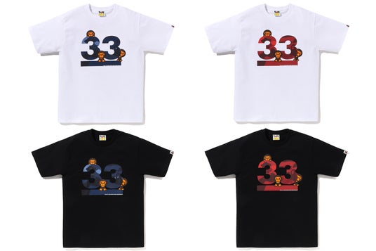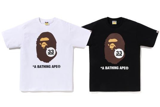 本アイテムは、「33」の数字をモチーフに、定番のAPE HEADにナンバリングを施したグラフィックを採用したTシャツをはじめとし、ブランドのアイコンを象徴的に表現したラインアップで展開します。