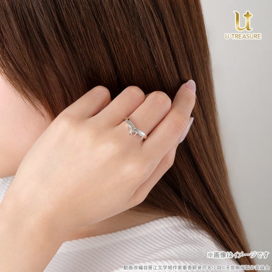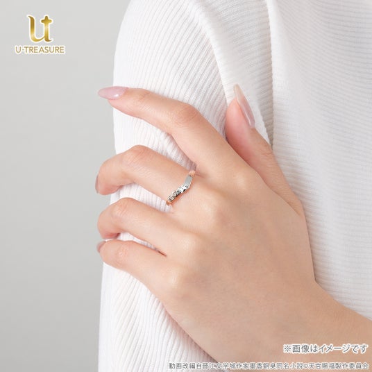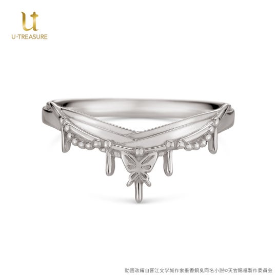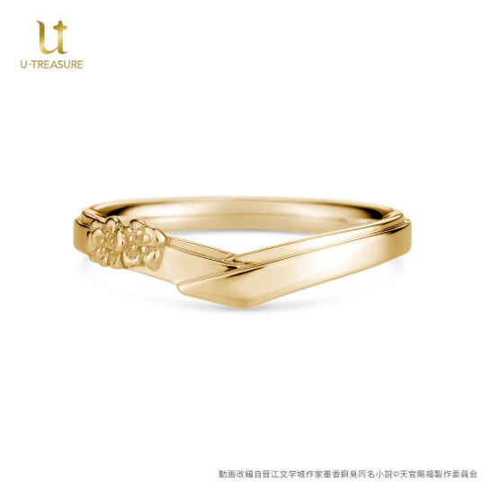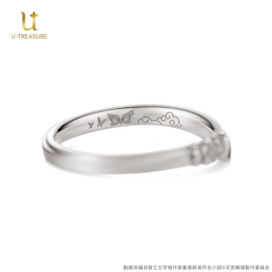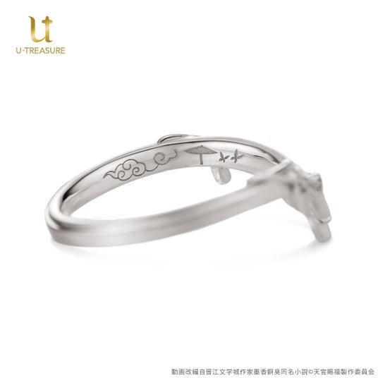 このたびの新作は、謝憐と花城それぞれのモチーフを立体的にデザインしたリング(指輪)です。細身のV字ラインが重ね着けも楽しめるようぴったりと合い、内側の刻印もモチーフでつながるデザインです。