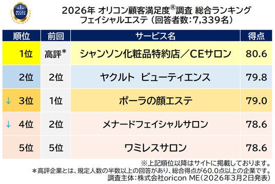 『フェイシャルエステ』総合ランキング(2026年 オリコン顧客満足度(R)調査)