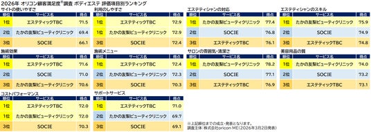 『ボディエステ』評価項目別ランキング(2026年 オリコン顧客満足度(R)調査)