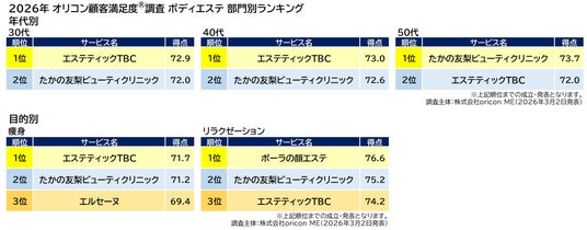 『ボディエステ』部門別ランキング(2026年 オリコン顧客満足度(R)調査)