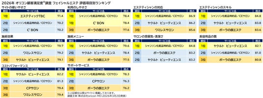 『フェイシャルエステ』評価項目別ランキング(2026年 オリコン顧客満足度(R)調査)