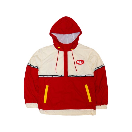 チームカラーのグランパスレッドにイエローを効かせたハーフジップのアノラックジャケット