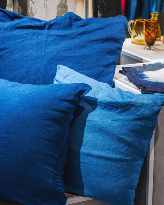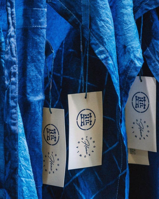 沖縄にて染料作り・染加工までを一貫して行い、藍の可能性を探求する〈琉球藍研究所〉とコラボレーションしたカプセルコレクション〈TOMORROWLAND HOME “Indigo”〉を数量限定で展開。