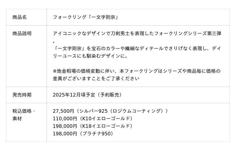 株式会社ユートレジャー(本社:東京都新宿区、代表取締役社長:青木 興一、株式会社ケイ・ウノの連結子会社)は、PCブラウザ・スマホアプリゲーム「刀剣乱舞ONLINE」とコラボレーションしたフォークリング(指輪)シリーズ第三弾「一文字則宗」ver.の予約受付を2025年12月頃より開始いたします。