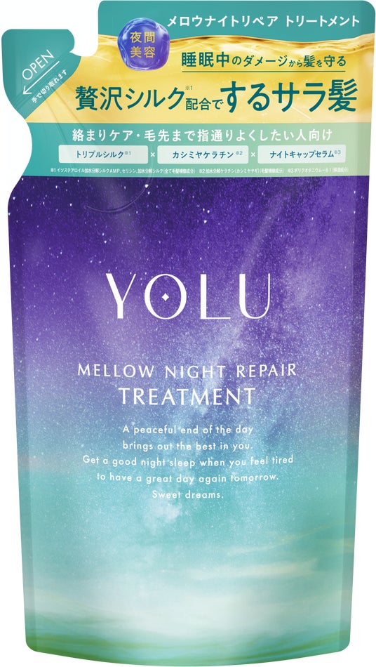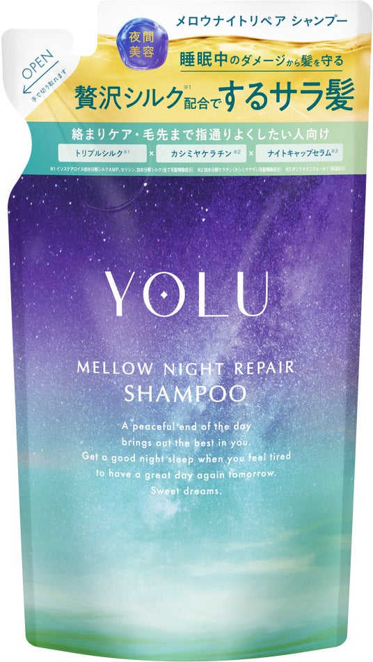 YOLUから新しく登場した「メロウナイトリペアシリーズ」は、毛先までまとまるのに、根元はべったり重くならず、まるでシルクのようなサラサラな仕上がりが特長。3種のシルク成分**とカシミヤケラチン***、パールエキス*4を配合することで、髪の内側・外側を段階的に補修して睡眠中の髪の絡まりを防ぎます。ジャスミンを基調としたアロマティックフレグランスは穏やかに安らぎたい夜にぴったりです。