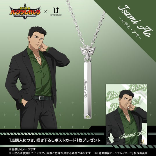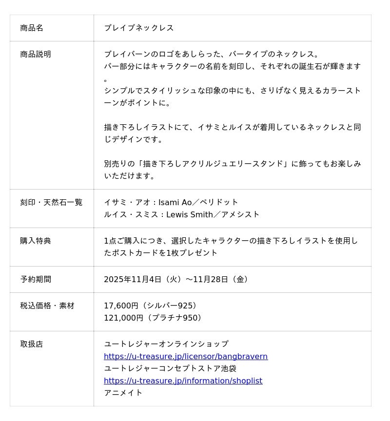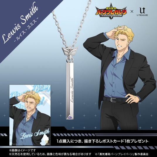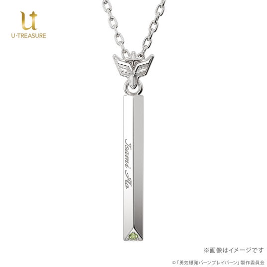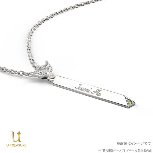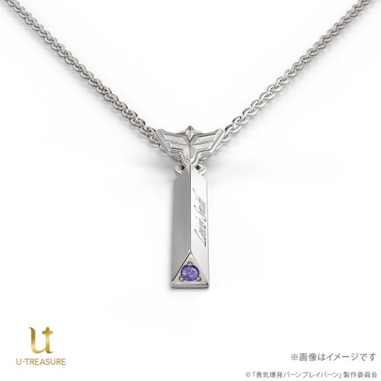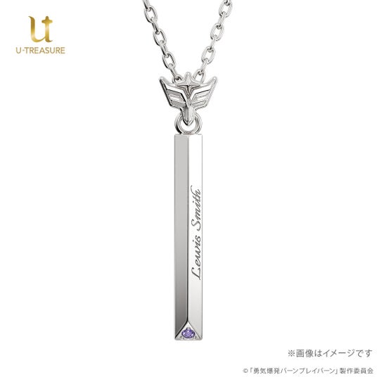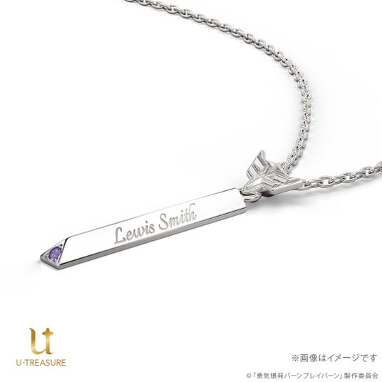 このたびの新作は、ブレイバーンのロゴをあしらったネックレスです。「イサミ・アオ」「ルイス・スミス」それぞれの名前を刻印し、誕生石をあしらった、描き下ろしイラストで着用しているネックレスとお揃いのデザインです。