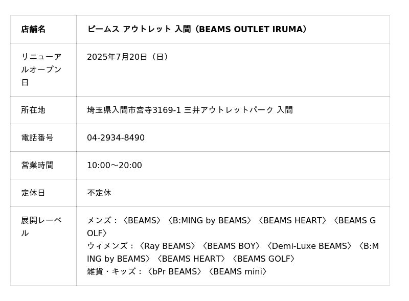 株式会社ビームス(本社:東京都渋谷区、代表取締役社長:設楽洋)は、アウトレット店舗として同社最大規模の「ビームス アウトレット 入間」(埼玉県入間市)のリニューアルオープンを発表します。