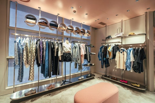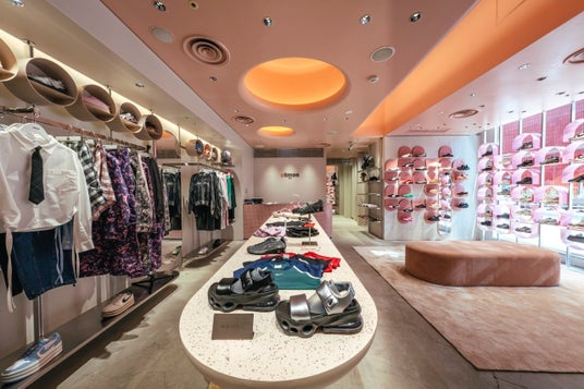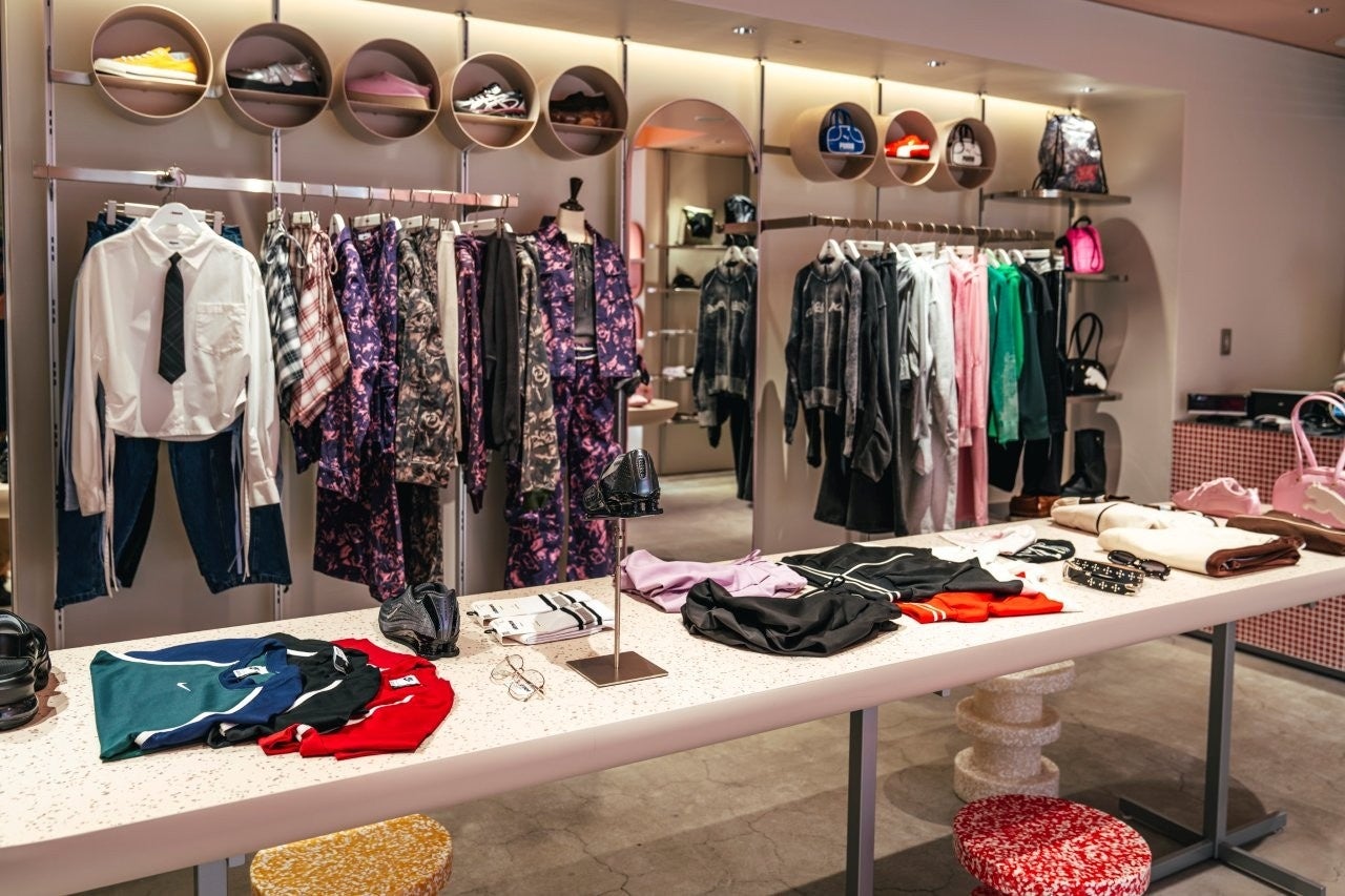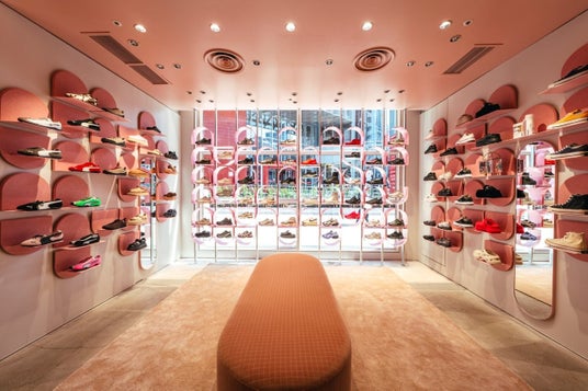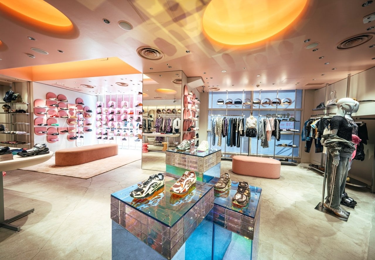 店内は落ち着いたピンクを基調とし、唯一無二の円形デザインが特徴のスニーカーウォールや、Head to toe でスタイリングをイメージできるアパレルウォールを設置。ゆっくりとお買い物が楽しんでいただけるよう大きなソファも用意され、ブティックのような空間となっています。