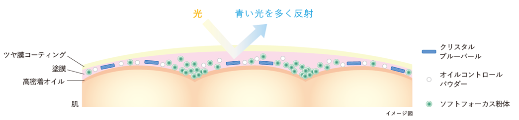 透明感のある肌に欠かせない光の反射。中でも、くすみのない明るい肌は青い光の反射量が多いことに着目した処方。「色」ではなく、青い「光」を強く反射することで、血色感を損なうことなく透明感と明るさを与えるクリスタルブルーパールを採用。肌との親和性が高い高密着オイルにより、ファンデーションの崩れを防ぎ、表情の動きに追従するツヤ膜コーティングが自然なツヤを演出。また、透明感を阻害するテカリや毛穴の目立ちを抑える2種のパウダーと合わせて 、白浮きのない自然なトーンアップが続く仕上がりを叶えます。