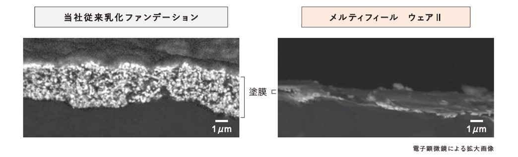 他剤型の当社ファンデーションに比べ、メルティフィール ウェアIIは、電子顕微鏡では塗膜内部を観察できないほどの薄い膜を形成。