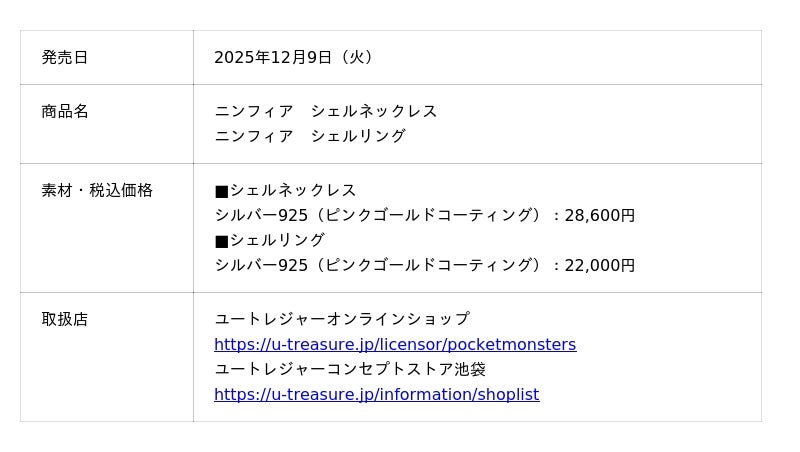 株式会社ユートレジャー(本社:東京都新宿区、代表取締役社長:青木 興一、株式会社ケイ・ウノの連結子会社)は、「ポケットモンスター」のニンフィアをデザインに施したネックレス・リング(指輪)を2025年12月9日(火)に発売します。ユートレジャーオンラインショップ、ユートレジャーコンセプトストア池袋にて取り扱います。
