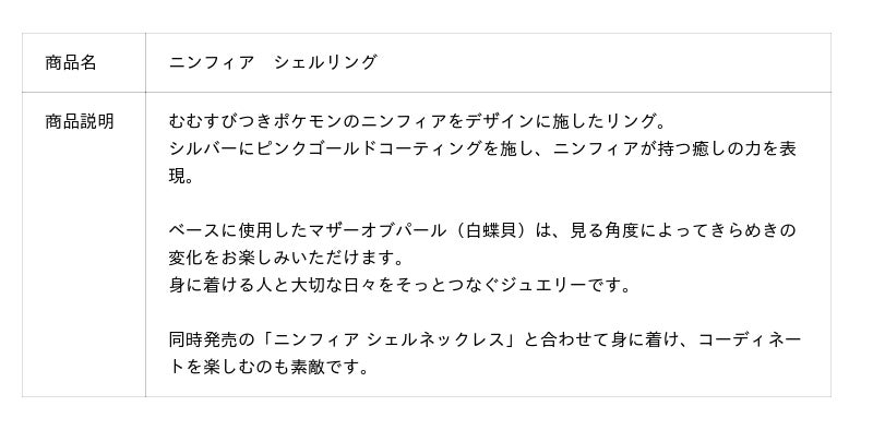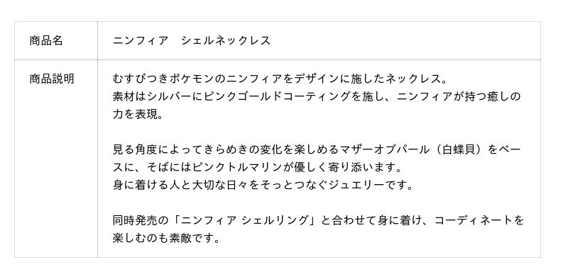 このたびの新作はニンフィアをモチーフにしたネックレス&リング(指輪)です。シルバーにピンクゴールドコーティングを施し、ニンフィアが持つ癒しの力を表現しました。セットで身に着けてコーディネートを楽しめるデザインです。