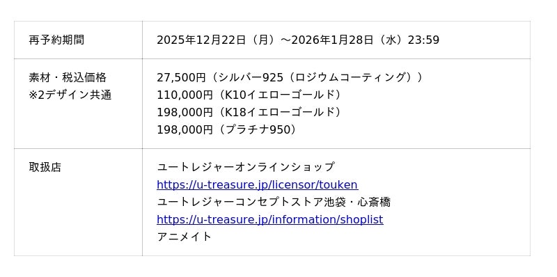 株式会社ユートレジャー(本社:東京都新宿区、代表取締役社長:青木 興一、株式会社ケイ・ウノの連結子会社)は、PCブラウザ・スマホアプリゲーム「刀剣乱舞ONLINE」とコラボレーションした「フォークリング(指輪)第一弾」の再予約受付を2025年12月22日(月)~2026年1月28日(水)の期間、ユートレジャーオンラインショップ、ユートレジャーコンセプトストア池袋・心斎橋にて行います。