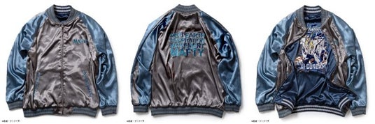 Ξ(クスィー)ガンダムモデルの表面は、渋めのネイビー地に少し暗めのシルバーを使用した落ち着いた配色で、フロントにはマフティーマークの刺繍を施し背面にはΞ(クスィー)ガンダムの迫力あるデザインを大胆な刺繍で表現しました。裏面は搭乗者であるハサウェイ・ノアのパイロットスーツをイメージし、ダークグレーにダークブルーグリーンの配色でシンプルな文字の刺繍を施したモデルです。