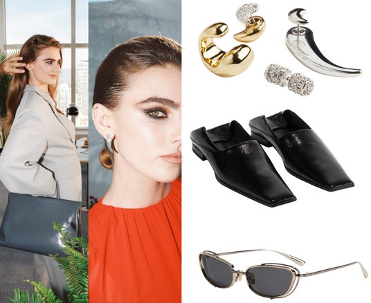 H&M Studio S/S25: ラージパッデッドバッグ¥9,999 ピアス&イヤーカフ 4個セット¥3,999 スクエアトゥ レザーローファー¥14,999 バイカラー オーバルサングラス¥7,999