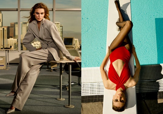 H&M Studio S/S25: 左:ウールブレンド ワイドショルダーブレザー¥29,999 ウールブレンドテーラードパンツ¥16,999 レザーパンプス¥16,999 右:ドレープホルターネックスイムスーツ¥6,999 レザーパンプス¥16,999